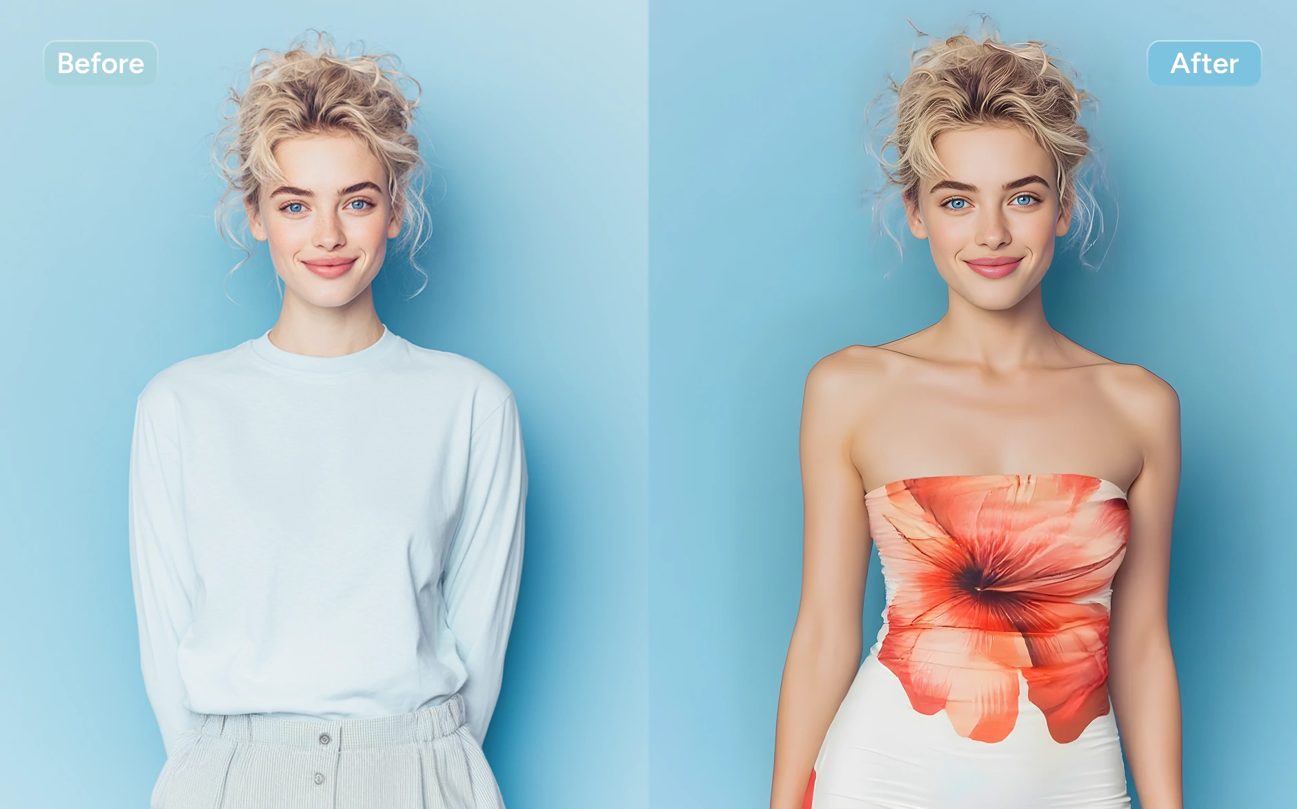 Say goodbye to the normal outfit style and personalize your wardrobe with your creativity with the help of AI AI tools. With our AI clothes changer, it takes only seconds to apply desired clothing to your photos, or swap unmatched outfits with your preferred style.