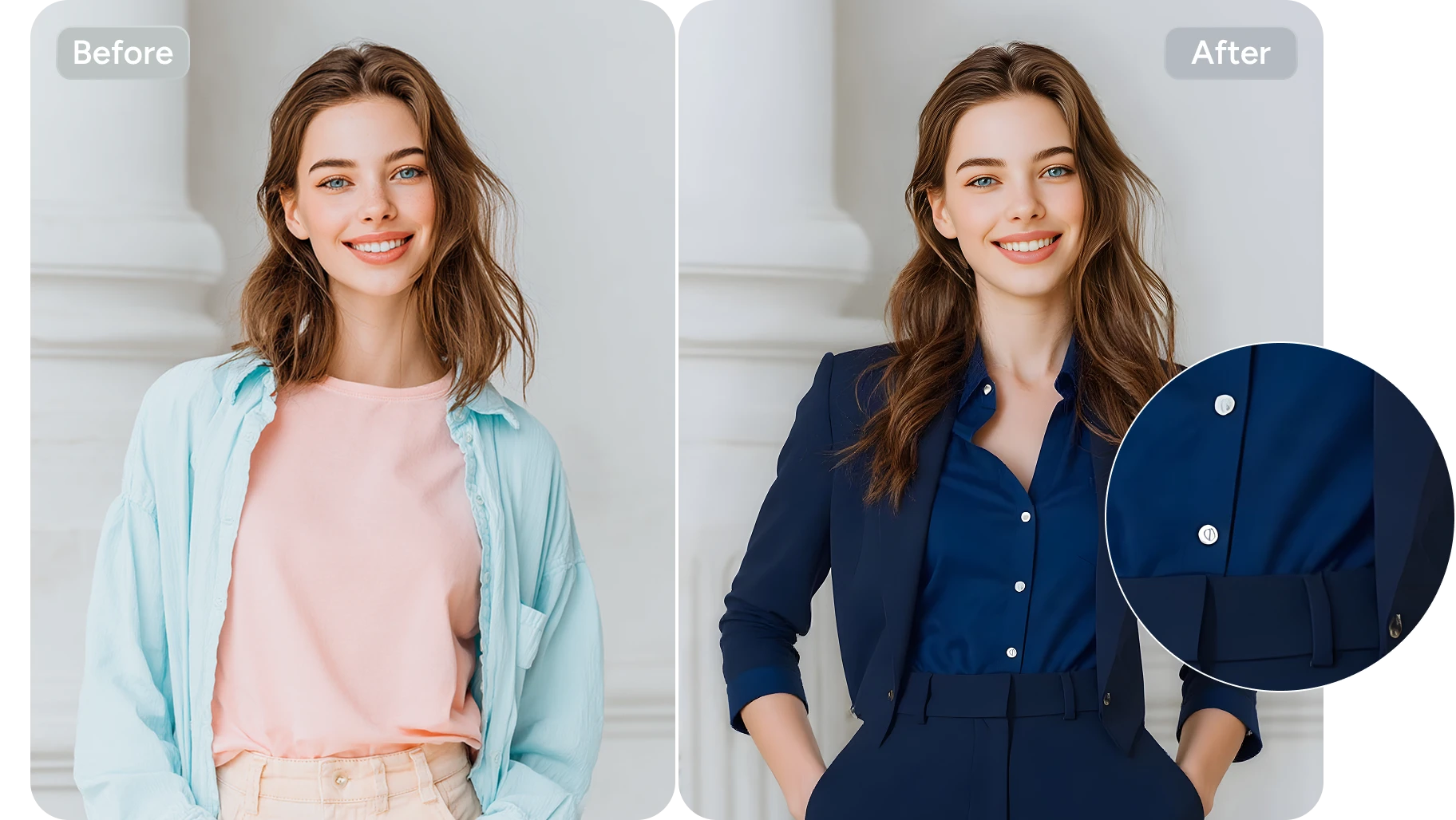 Have looked through all the clothes in your wardrobe, but couldn't find what you wanted to wear? Don't worry, our free AI clothes changer brings a ready-made dream wardrobe to life. Utilizing top-notch, perfectly trained algorithms, our AI-powered outfit changer lets you change outfits naturally and instantly. Easily upload your images to our online tool and select your favorite clothing styles from the wardrobe templates. Seconds later, you'll get flawless, highly detailed and realistic results.